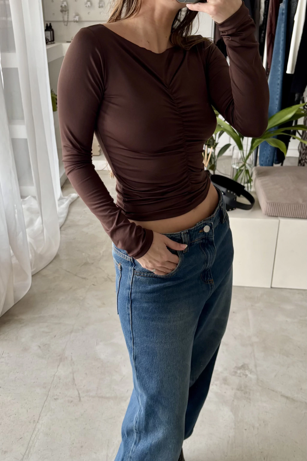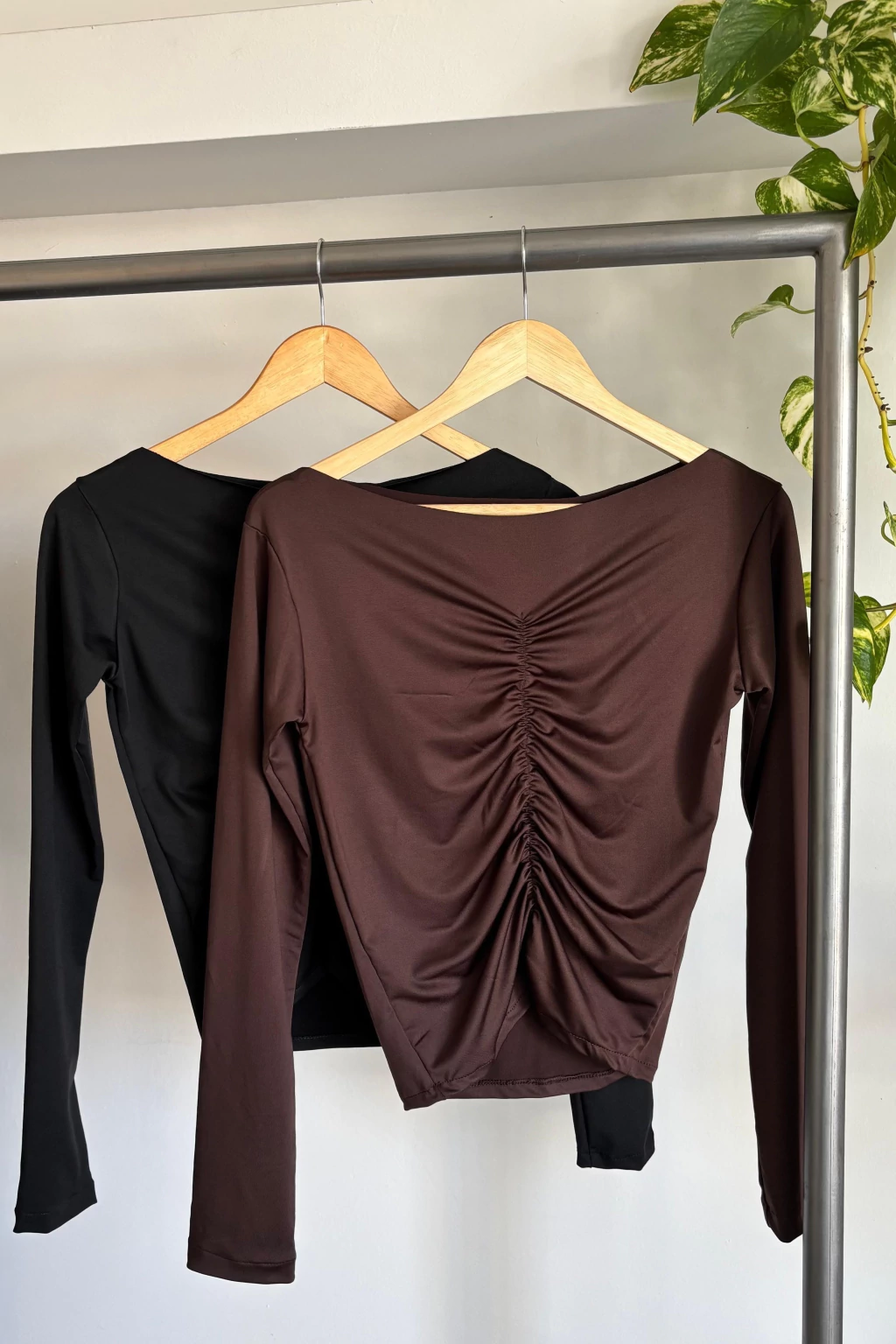Remera confeccionada en microfibra premium. En sus detalles se puede ver la apertura amplia tipo bote en el cuello y en su delantero un frunce. La tela elastiza mucho.
