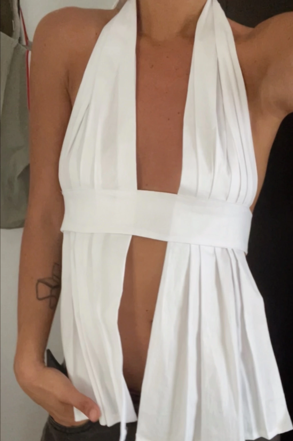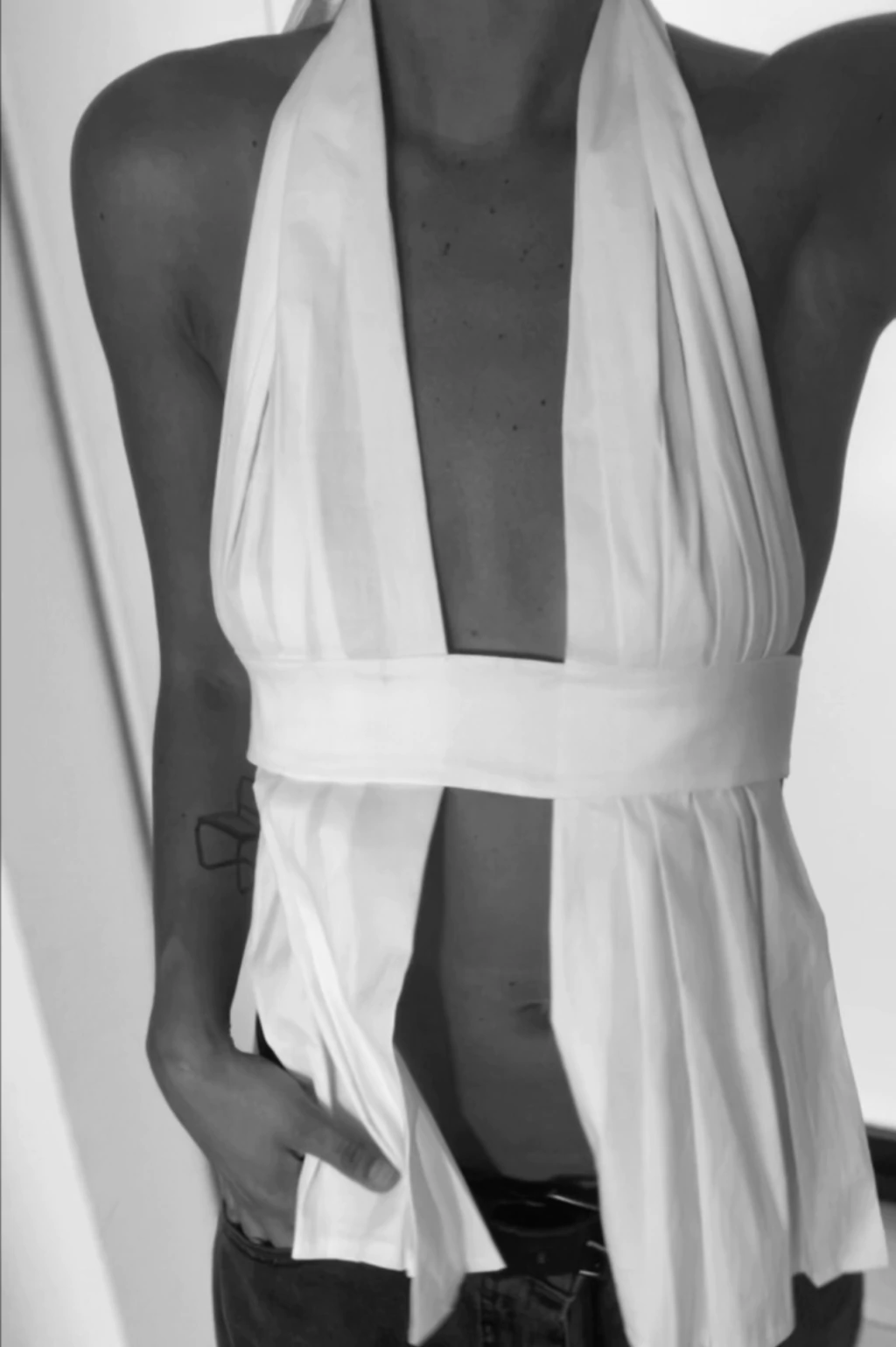 Top confeccionado en poplin premium, su diseño cuenta con 2 tapas tableadas unidas por un lazo bajo el busto. Es regulable en cintura y cuello. No transparenta. El género es plano es decir, sin elastano.